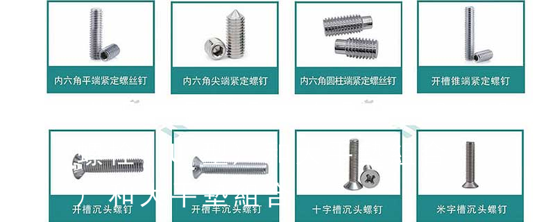 螺栓類:外六角螺栓、外六角法蘭面螺栓、內六角圓柱頭螺栓、吊環螺栓、膨脹螺栓、沉頭內六角螺栓、盤頭內六角螺絲、馬車螺栓、雙頭螺栓、蝶型螺絲、活節螺栓、地腳螺 栓、U型螺栓、四角螺栓等 螺帽類:鉚螺母、吊環螺母、